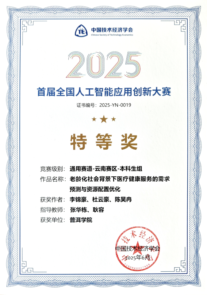 近日,由中国技术经济学会主办、昆明理工大学承办的首届全国人工智能应用创新大赛云南省区域赛颁奖仪式在昆明圆满落幕。来自全省各高校的优秀团队同台竞技,最终,普洱学院数学与统计学院李锦豪、杜云豪、陈吴冉三位同学在通用赛道云南赛区本科生组中荣获特等奖。